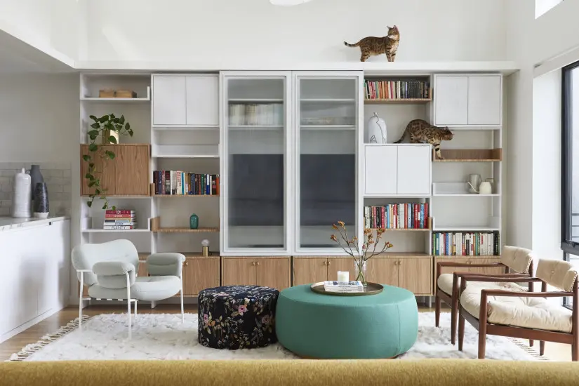 Studio Nato created a media console that doubles as a cat "climber" for a pair of Bengal cats in a Prospect Heights penthouse apartment.